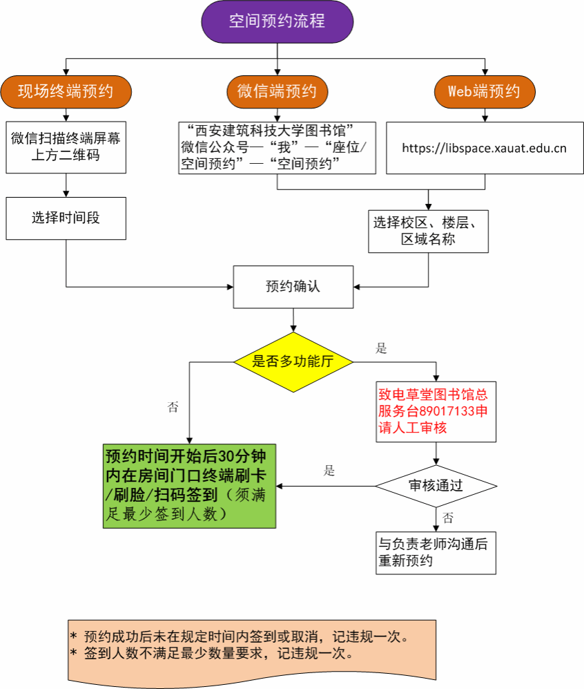 多功能厅实行线上预约+人工审核,仅支持教职工预约,可添加学生作为参与成员,单次最少预约人数2人,最多预约人数(西-01:140人,西-02:30人,西-03:60人),预约后请致电草堂校区总服务台(029-89017133)进行人工审核。多功能厅最少签到人数1人(师生成员均可)。