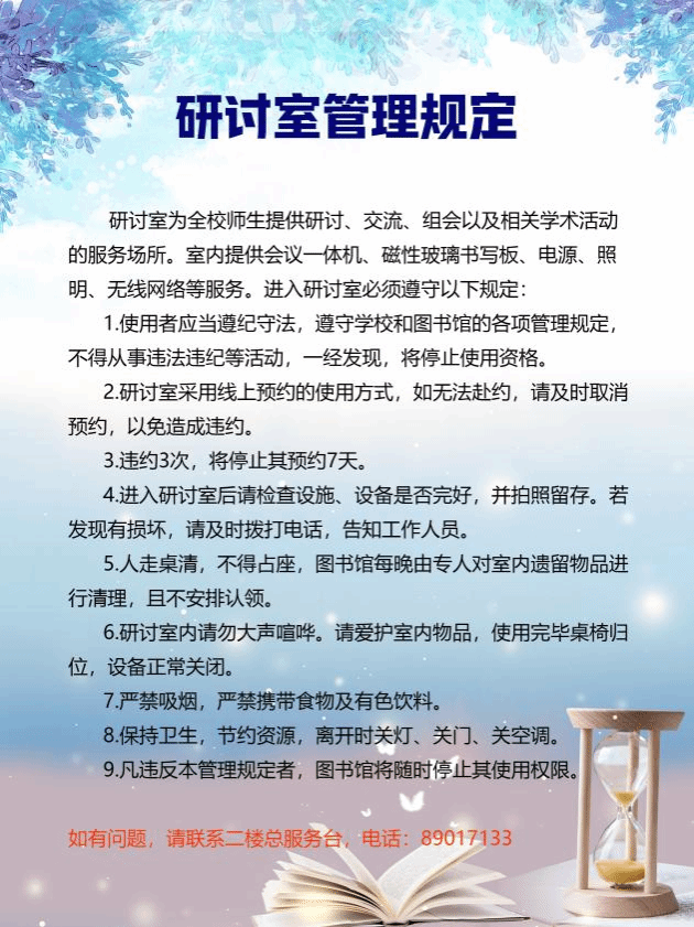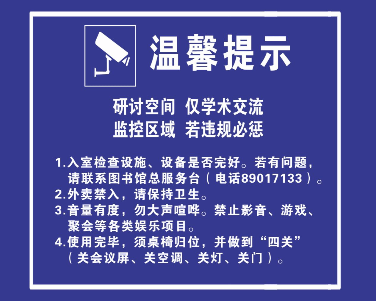 图书馆借研讨间恢复使用之机,再次明示我校研讨室管理规定,对违反《图书馆研讨室管理规定》的行为,图书馆将依规严惩: