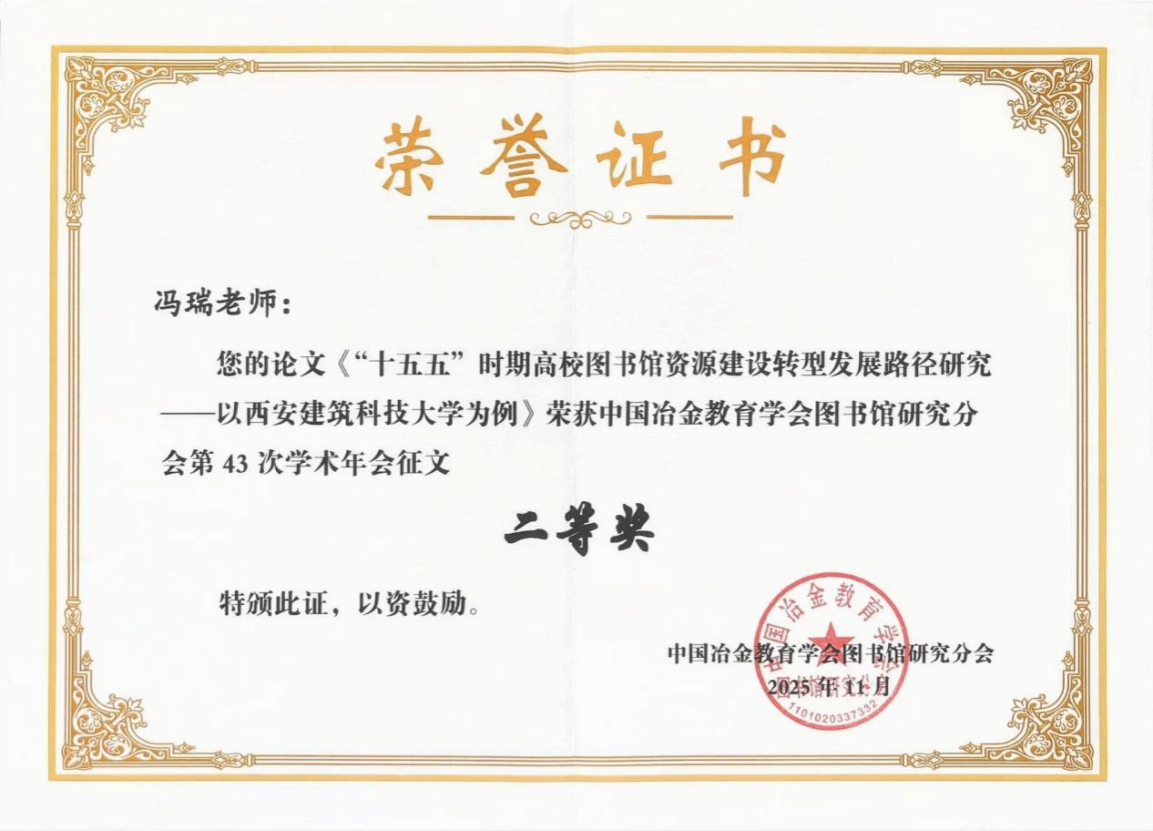 优秀论文评选中,我馆职工冯瑞撰写的《“十五五”时期高校图书馆资源建设转型发展路径研究——以西安建筑科技大学图书馆为例》亮点突出:紧扣“十五五”战略导向,以我校为样本,剖析数字化转型、供需匹配等核心挑战,提出创新性发展路径,研究兼具时代性与针对性,为我校及同类高校图书馆提供可复制的实践范本,获会议论文二等奖;赵蕾、王敏杰、顾慧敏共同撰写的《人工智能时代与未来学习双重视角下高校图书馆智慧馆员队伍建设研究》深具价值:立足AI赋能教育变革背景,聚焦未来学习对图书馆服务的新要求,构建“能力重构-角色转型-机制保障-生态协同”四位一体建设路径,结论兼具数据支撑与实操性,为破解人才瓶颈提供重要参考,获会议论文三等奖。两篇论文从资源、队伍建设核心维度发力,尽显我校图书馆教师前沿视野与务实研究精神。