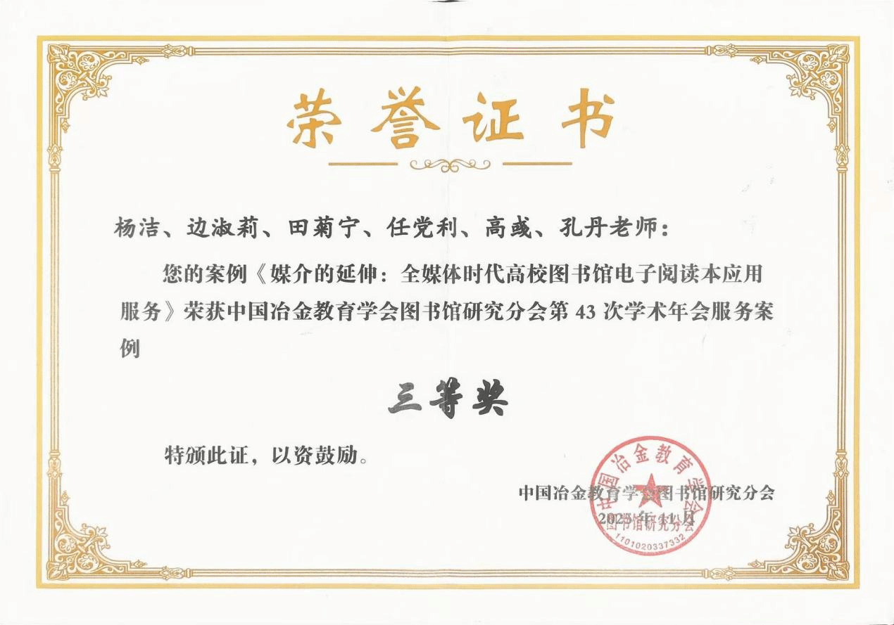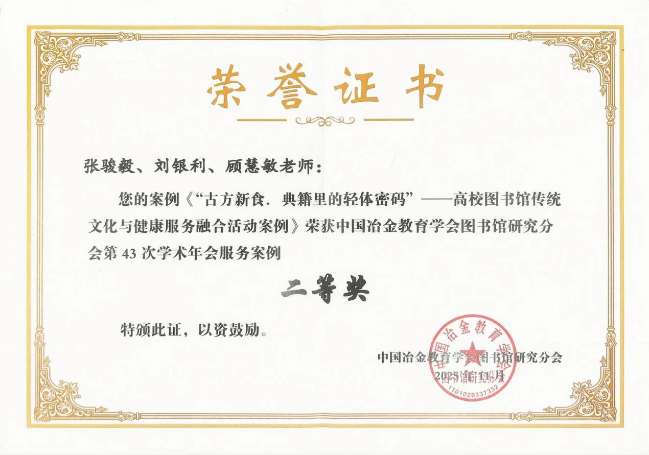 成果案例评选中,我馆职工张骏毅、刘银利、顾慧敏完成的《“古方新食,典籍里的轻体密码 —— 高校图书馆传统文化与健康服务融合活动案例》,创新融合传统文化与师生健康需求,以新颖理念、清晰路径与显著成效,获服务案例二等奖;杨洁、边淑莉、田菊宁、任党利、高彧、孔丹完成的《媒介的延伸:全媒体时代高校图书馆电子阅读本应用服务》,紧扣时代传播特点与阅读需求变革,梳理多元应用场景与创新模式,为行业数字化转型赋能,获服务案例三等奖。