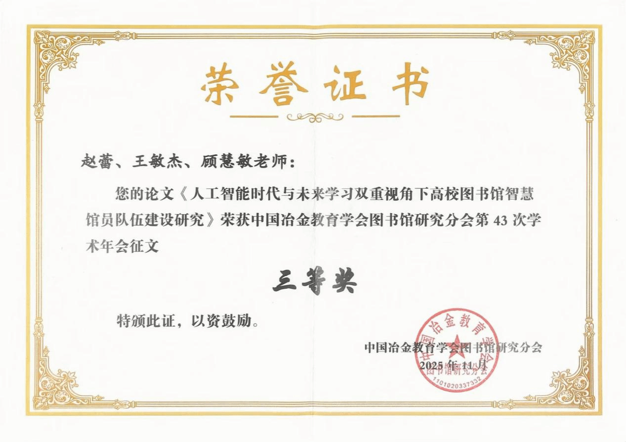 近日,2025 中国冶金教育学会图书馆研究分会第43次学术年会在桂林市顺利举办,来自我校及全国冶金行业高校图书馆的40余位代表参会,共同探讨AI时代背景下高校图书馆发展的新路径。此次年会以“数智赋能·融合共生:‘十五五’规划下的图书馆新使命”为主题,设置优秀论文与服务案例评比表彰环节,我馆多位职工喜获奖项。