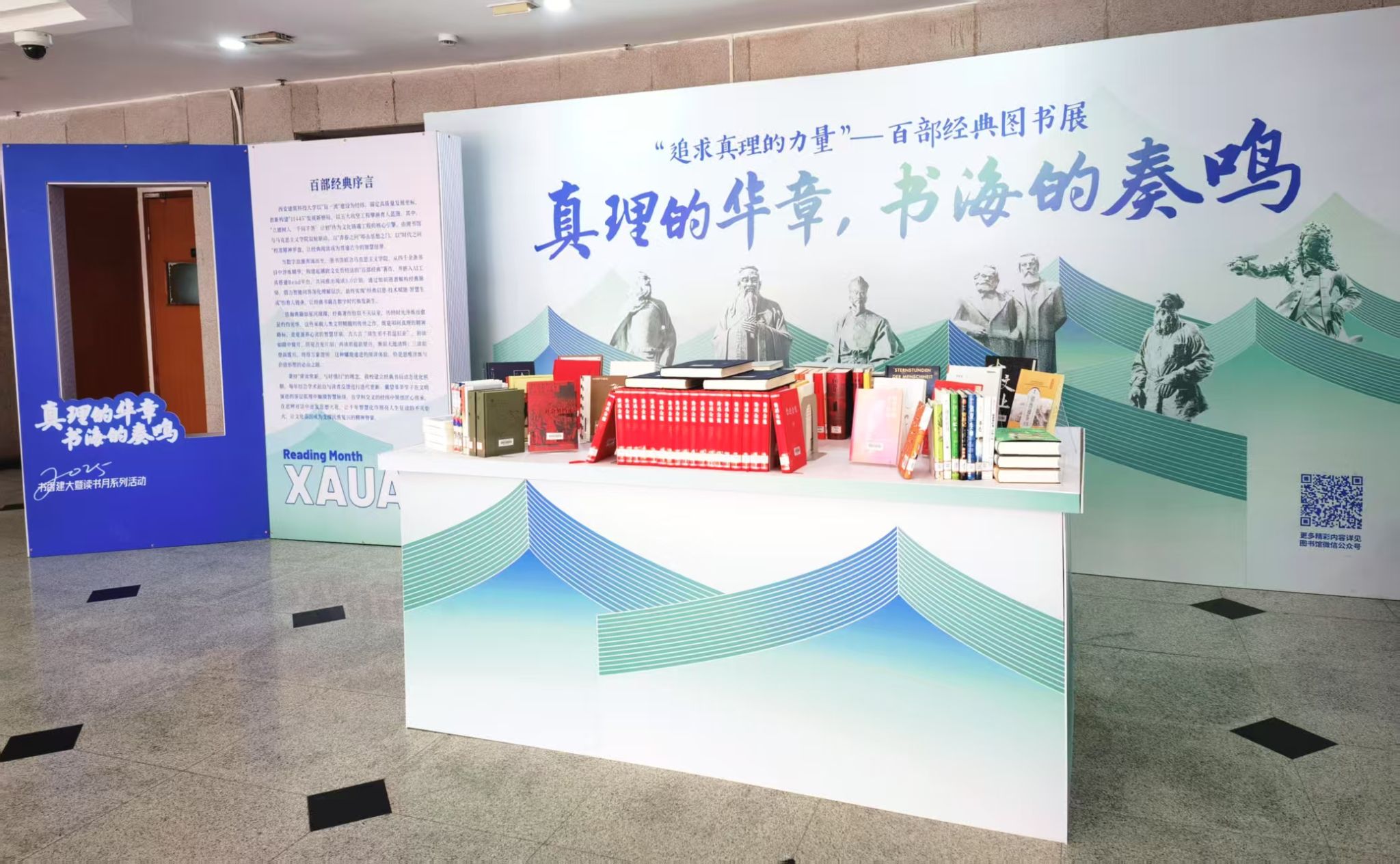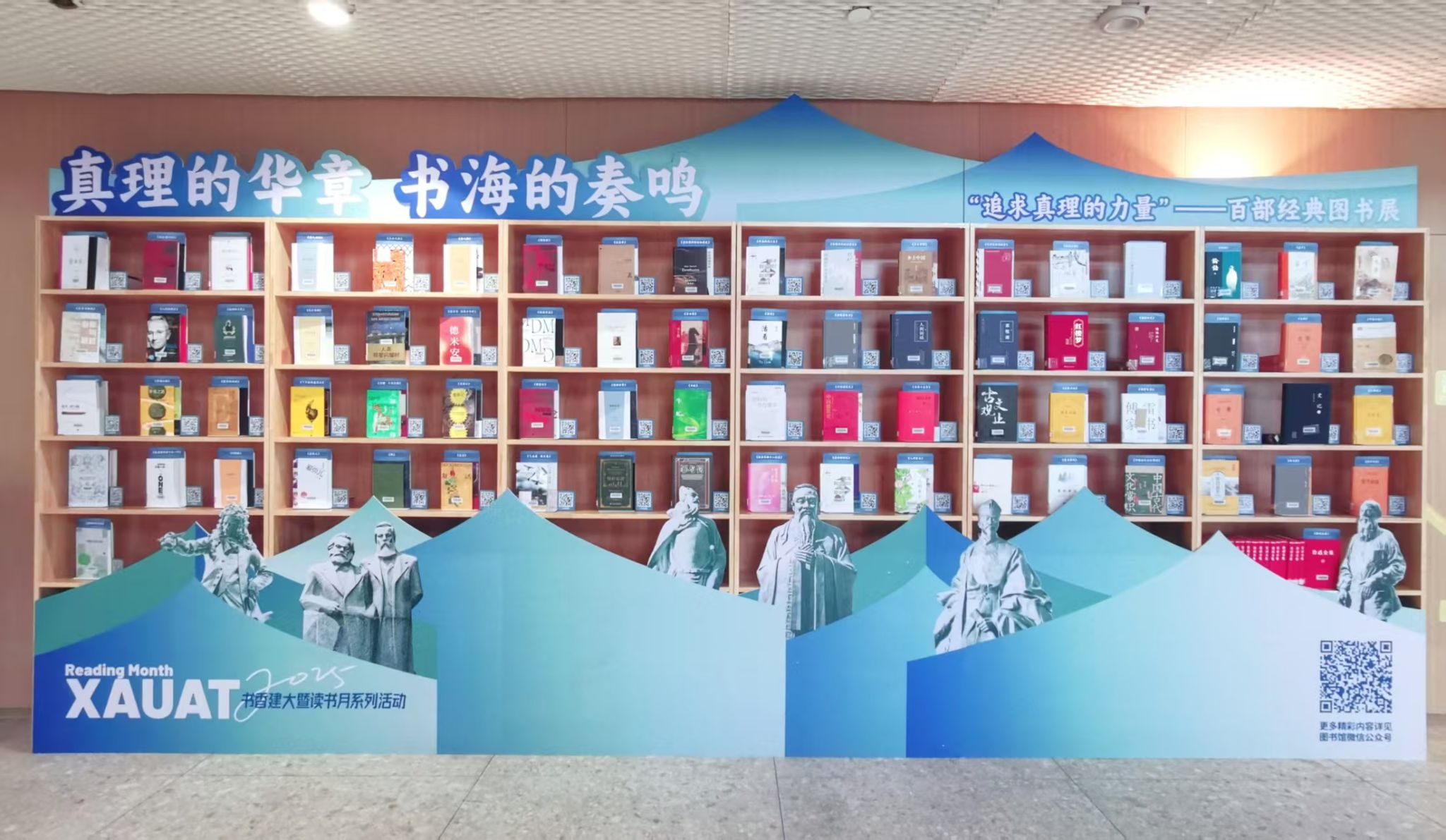 值“世界读书日”到来之际,我馆在雁塔、草堂两校区同时展出百部经典,并配以电子书阅读二维码,方便读者以最便捷的方式与经典进行“深层次的思想交流”,从中汲取营养,提升文化素养,铸造更高尚的精神品格。我们秉持“常读常新,与时共进”的理念,每年会根据学术前沿、社会热点和读者反馈,对百部经典书目进行迭代更新。经典书籍,是人类思想长河中熠熠生辉的明珠,承载着历史的记忆、文化的积淀、人性的菁华。让我们以经典为伴,与智慧同行,在人间最美四月天,共享阅读快乐。希望大家在思辨对话中迸发思想火花,让千年智慧化作照亮人生征途的不灭炬火。让我们共同期待“百部经典”在西安建筑科技大学这片沃土上生根发芽,绽放出绚烂的思想之花。