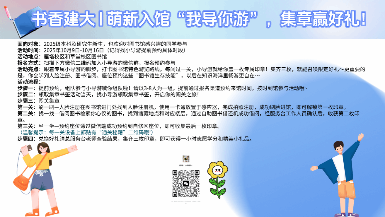 活动亮点:跟着专属小导游的脚步,打卡图书馆特色游览路线,每闯过一关,小导游就给你盖一枚专属印章!集齐三枚,就能召唤限定好礼~更重要的是,你会学到人脸注册、图书借阅、座位预约这些“图书馆生存技能”,以后在知识海洋里畅游更自在~