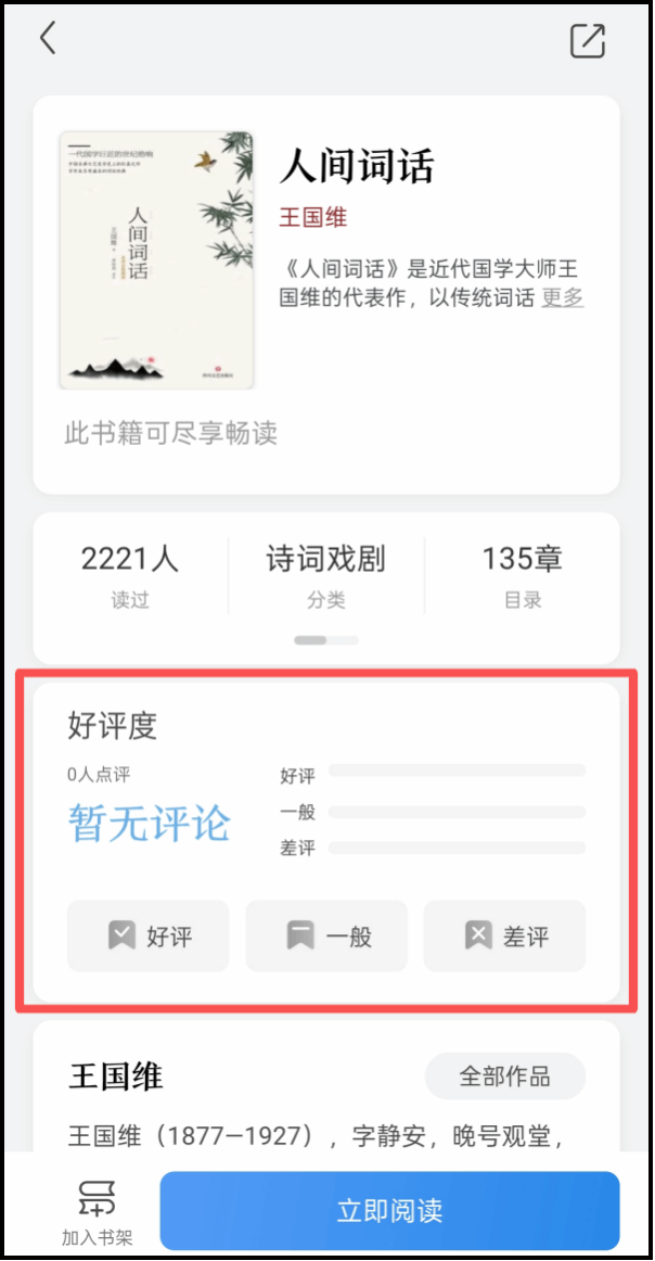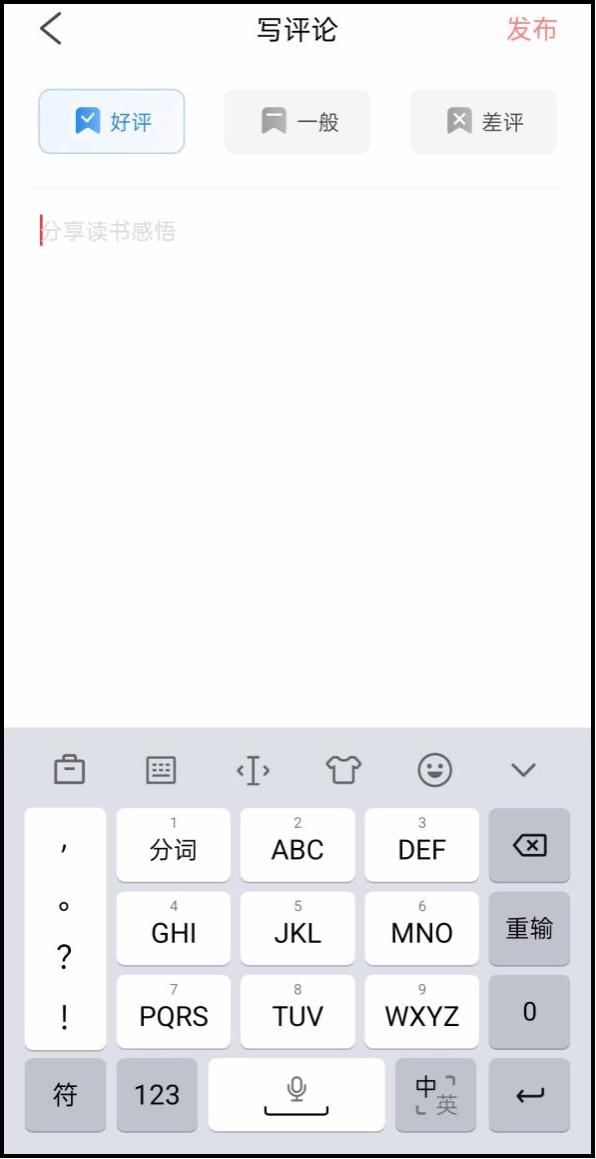 进入所选图书界面,在“好评度”专栏选“好评”撰写,发布后书评实时同步至 APP “圈子” 模块。