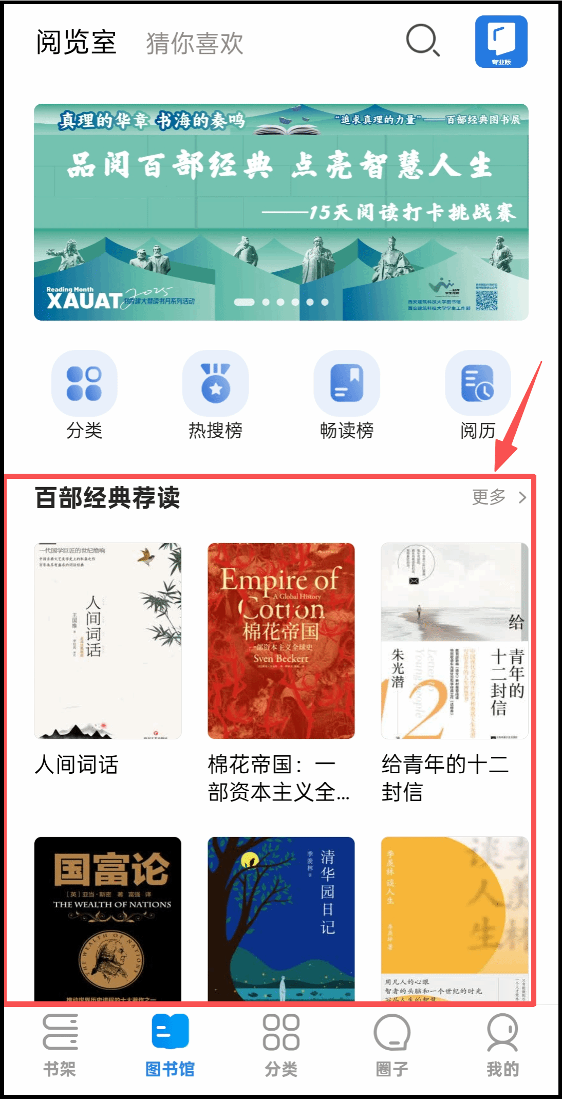 1.书籍选择:“百部经典荐读”专栏中选择任意图书阅读。