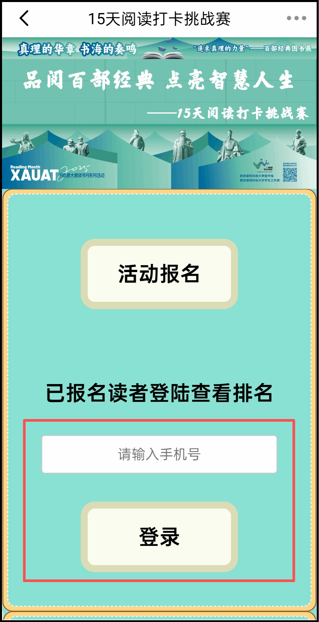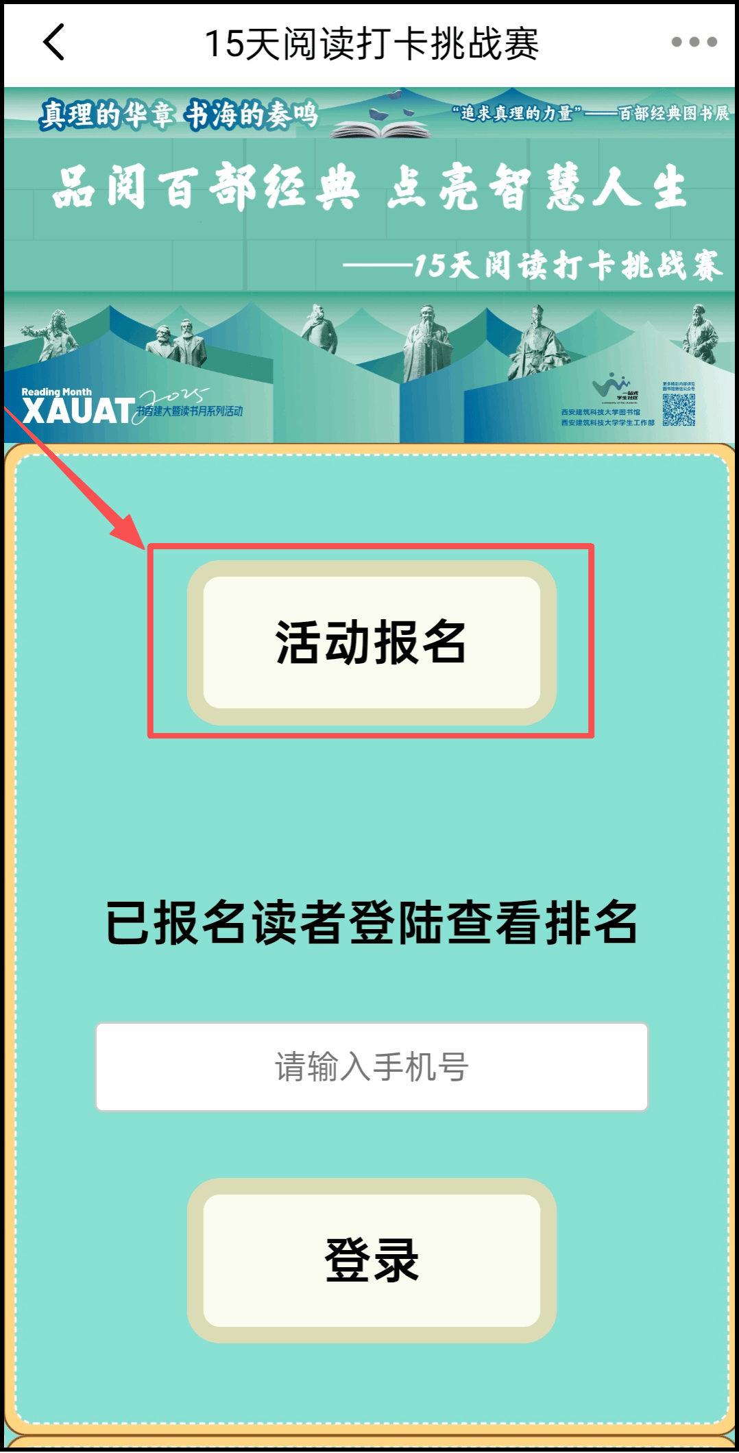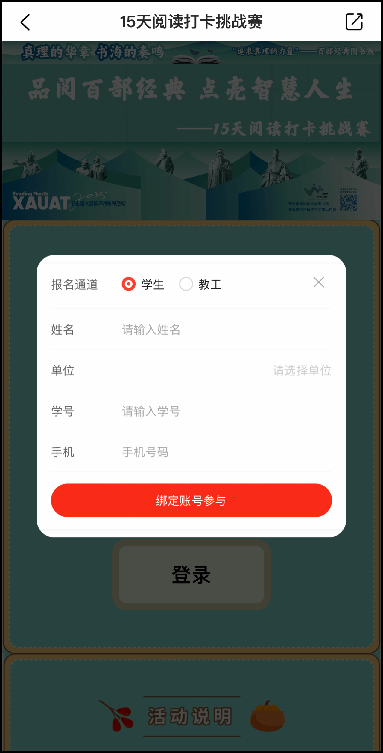 登录APP后,点击页面上方的“品阅百部经典 点亮智慧人生——15天阅读打卡挑战赛”活动图进入活动页面,输入姓名、手机号、学号等信息确认报名。